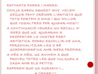 ESTIMATS PARES IMARES: COM JA SABEU AQUEST ANY VOLEM SEGUIR FENT CRÈIXER L’ARTISTA QUE TOTS PORTEM A DINS I QUI MILLOR QUE VOSALTRES PER AJUDAR-NOS!!! A CONTINUACIÓ VEUREU UN RECULL D’ IDEES QUE US AJUDARAN A DESPERTAR LA VOSTRE PART ARTÍSTICA. PODEU ESCOLLIR-NE UNA, PERSONALITZAR-LES O BÉ SORPRENDRE’NS AMB IDEES PRÒPIES. A MÉS A MÉS, US ANIMEM A QUE PROVEU TOTES LES QUE VULGUEU A CASA AMB ELS PETITS. ESPEREM QUE US AGRADIN I... A CREAR!!!!