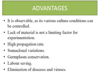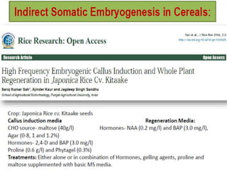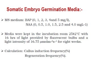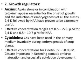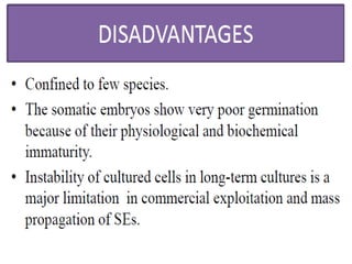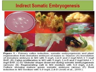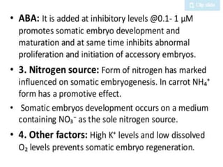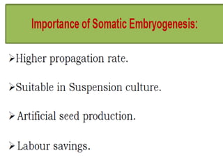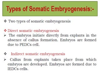 Somatic embryogenesis is the process where embryos form from sporophytic cells in vitro rather than from a zygote. There are different types of embryos including zygotic, formed from fertilized eggs, and somatic embryos which form directly from other plant tissues and organs in culture. The correct developmental stage of the explant tissue is crucial for initiation of embryogenic callus formation in somatic embryogenesis, with young or juvenile explants producing more embryos than older explants.