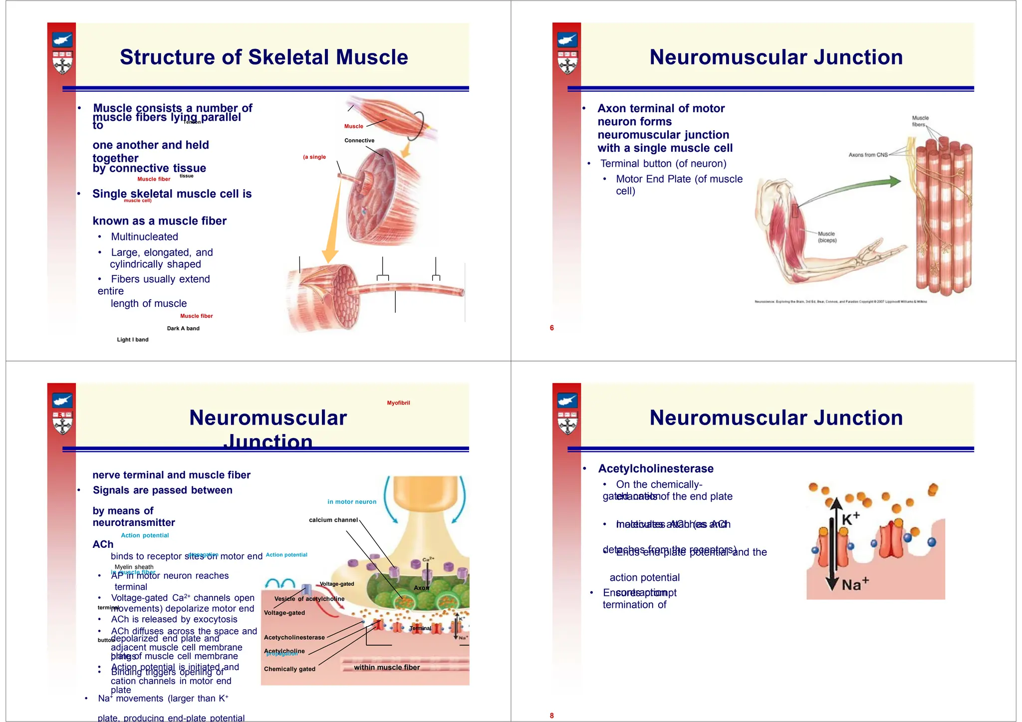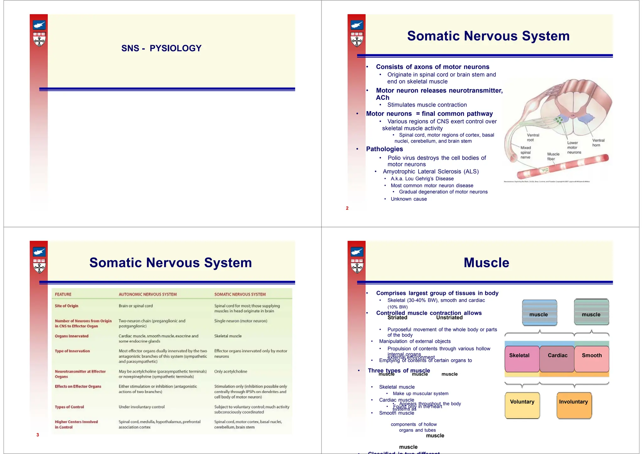 The document provides an in-depth overview of the somatic nervous system and muscle physiology, detailing the roles of motor neurons, muscle contraction mechanisms, and structure of skeletal muscle fibers. It discusses the neuromuscular junction and its susceptibility to various toxins and diseases while explaining the sliding filament theory and excitation-contraction coupling. Additionally, the document covers the types of muscle fibers, energy metabolism during muscle activity, and factors influencing muscle fatigue and performance.