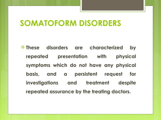 Somatiform disorders are characterized by physical symptoms that cannot be explained physically. They result from psychological factors and cause significant impairment. The disorders include somatization disorder, hypochondriasis, somatoform autonomic dysfunction, and persistent somatoform pain disorder. Treatment involves ruling out physical causes, evaluating psychological stressors, and using antidepressants, psychotherapy, and alternative therapies to help patients develop more effective coping strategies.