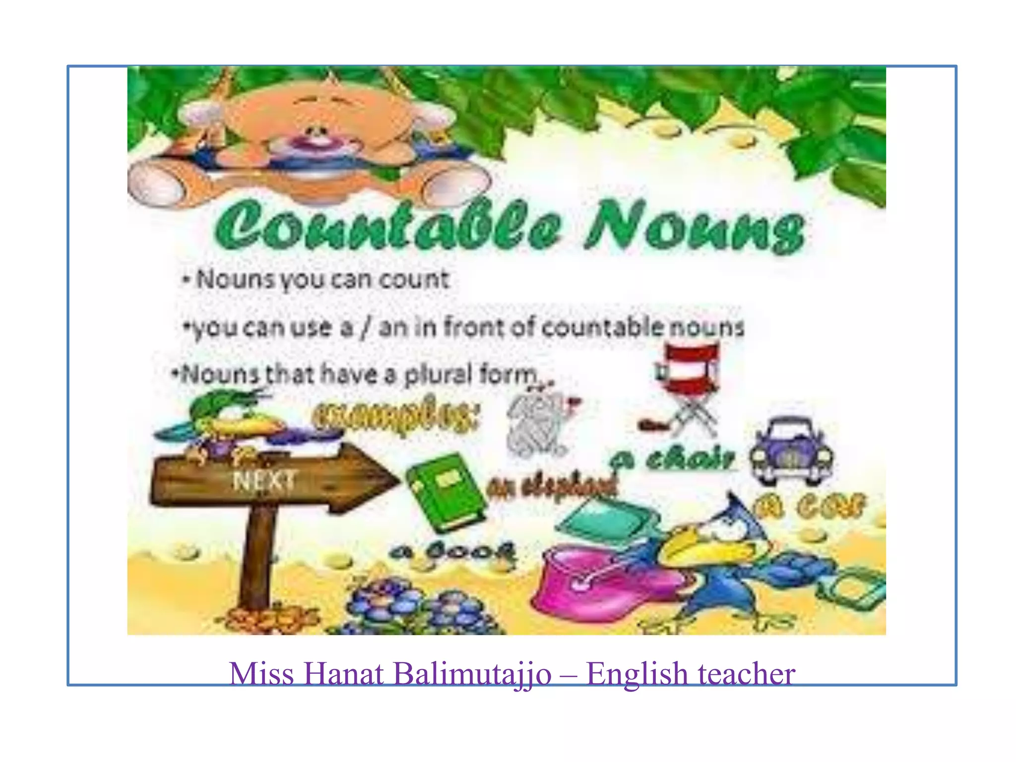 The document provides information and examples about countable and uncountable nouns in English. It discusses how countable nouns can take plural 's' and examples are given for countable nouns like banana and sofa. Uncountable nouns cannot be pluralized and examples given include milk and coffee. The document then provides exercises for learners to practice identifying countable vs. uncountable nouns and using correct articles like 'a' and 'an'. Further examples are given around quantity words like 'some' and 'any' as well as countable vs. uncountable quantities.