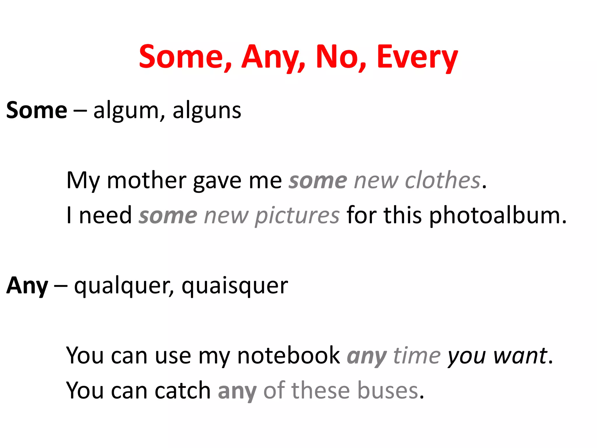 This document summarizes the uses of the words "some", "any", "no", and "every" in English. It explains that "some" is used in affirmative sentences offering suggestions or invitations. "Any" is used in negative or interrogative sentences. "No" is used in affirmative sentences to indicate negation. "Every" refers to all cases without exception and is used with things that happen regularly. Examples are provided to illustrate the uses of each word. Exercises are included to reinforce understanding.