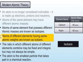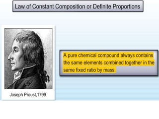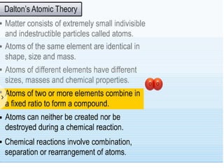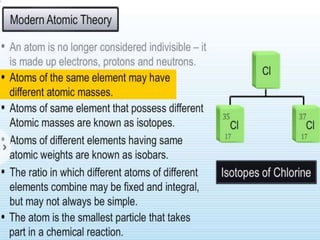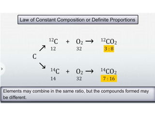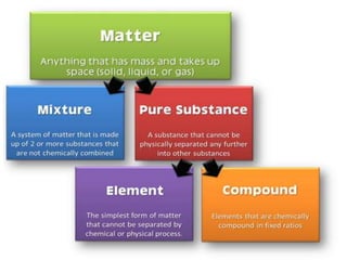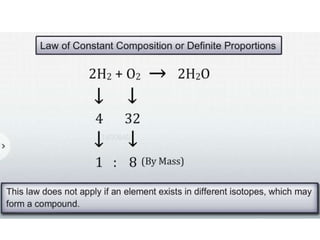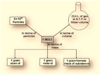 Chemistry is the study of matter and its interactions. The basic units that make up all matter are atoms, which combine to form molecules. Atoms are made up of protons, neutrons, and electrons. The number of protons in an atom determines its atomic number, while the total mass of an atom is determined by its atomic mass number. Molecules are combinations of atoms that are bonded together chemically. The mole is a unit used to measure amounts of substances, equal to 6.022x1023 particles. Stoichiometry uses mole ratios to calculate amounts of reactants and products in chemical reactions.