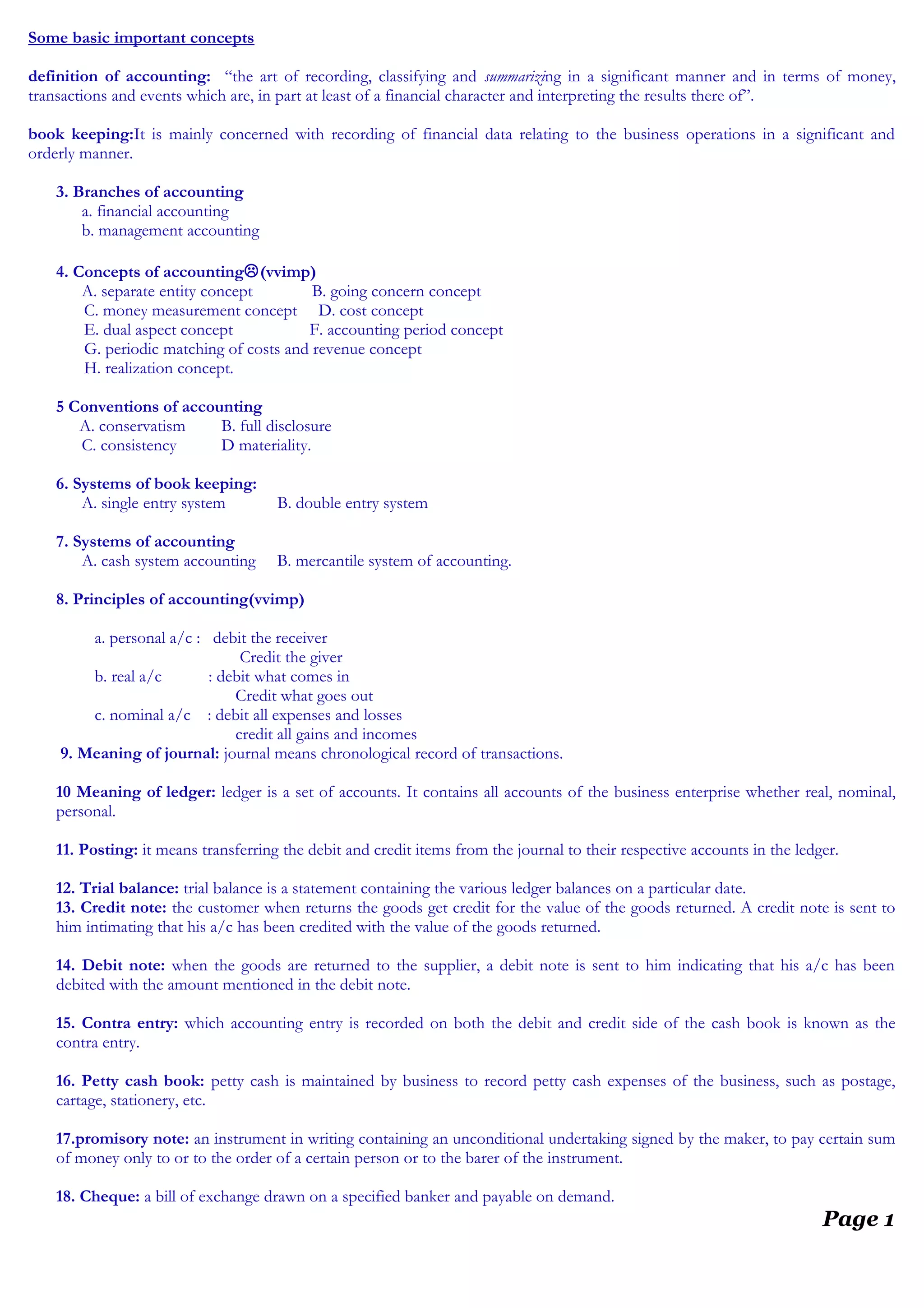 This document defines key accounting concepts and terms. It covers the definition of accounting, bookkeeping, the branches of accounting, accounting concepts and conventions, accounting systems, principles, journals, ledgers, and other fundamental accounting topics. It also defines financial management concepts such as capital structure, weighted average cost of capital, capital budgeting techniques like payback period, net present value, and internal rate of return.