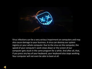 Virus infections can seriously impair computers and damage businesses by destroying the system registry or the entire computer. Viruses slow down computers by causing the screen to get stuck in programs or making the keyboard stop working, and may prevent the computer from booting. To protect against viruses, it is important to always have the firewall turned on, keep programs and software updated with necessary service packs, run antivirus software daily using a paid rather than free version, update antispyware/adware weekly to maintain computer speed, enable pop-up blocking, be wary of suspicious emails and files from messengers, and take care when downloading programs. Botnets work by infecting computers with viruses that allow hackers to remotely control large networks of compromised