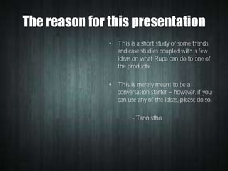 The document presents a short study on the strategies and ideas for the Rupa Kidline brand, aimed at enhancing its market presence and targeting a new consumer segment. It emphasizes building brand recognition and consumer loyalty through innovative campaigns, emphasizing engagement with children and parents. The document also suggests specific initiatives like creating a children's social network and web series to foster brand connection and engagement in an evolving market landscape.