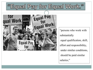 This document discusses the concept of equal pay for equal work. It outlines the Equal Pay Act of 1963 which requires that employees performing jobs that require equal skill, effort, and responsibility under similar working conditions be paid similar salaries. The key aspects of "equal work" are defined as equal skill, equal effort, and equal responsibility. The document also notes that it is illegal to pay employees different wages based on their sex or to reduce an employee's wages. Finally, it briefly discusses the concept of a "fair day's pay for a fair day's work."