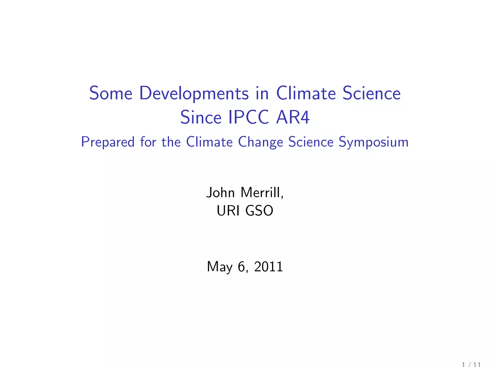 The document discusses recent developments in climate science since the IPCC AR4, highlighting significant declines in Arctic sea ice extent and thickness, as well as observed warming trends in Antarctica. It reports on the acceleration of mass loss from ice sheets, with projected contributions to sea level rise outpacing other factors. The findings indicate that ice sheet loss could become the dominant source of sea level rise in the coming century if current trends continue.