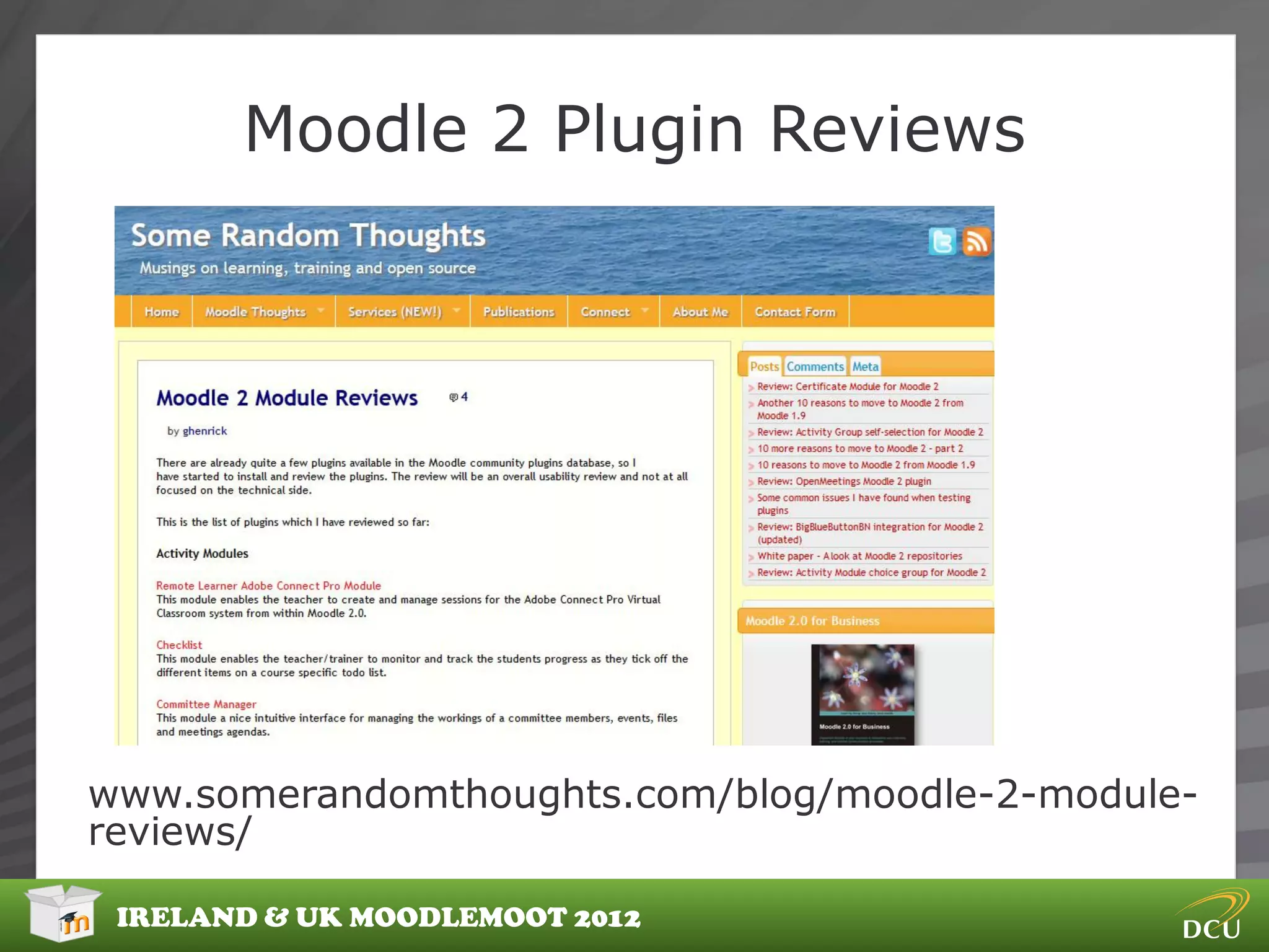 This document provides a summary of Gavin Henrick's presentation on Moodle plugins at the Ireland & UK MoodleMoot 2012 conference. The presentation reviewed several popular Moodle plugins, providing the download link and a link to an external review for each. It focused on plugins' ease of use, features, and documentation. The presentation also provided information on Gavin Henrick's background and contact information.