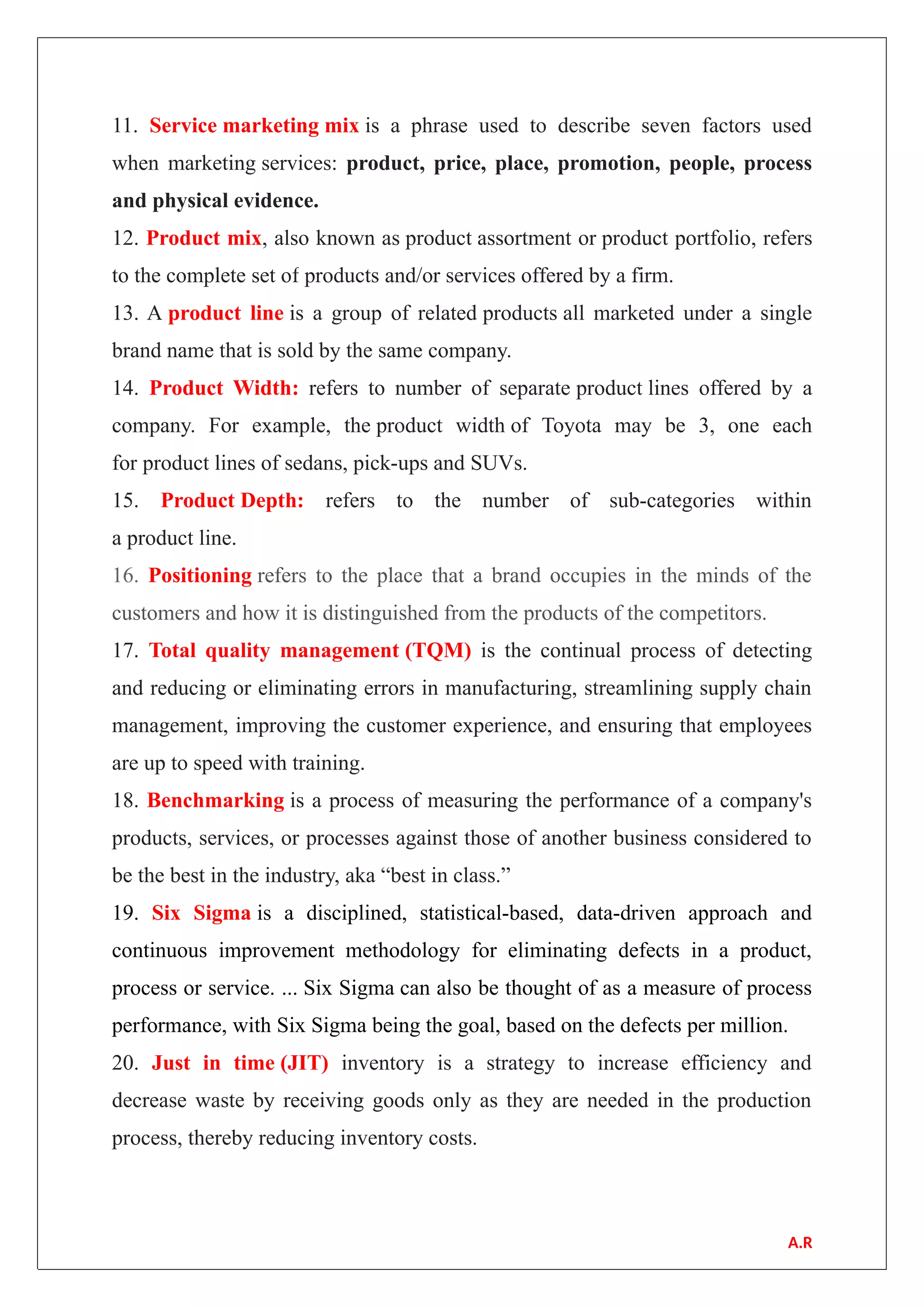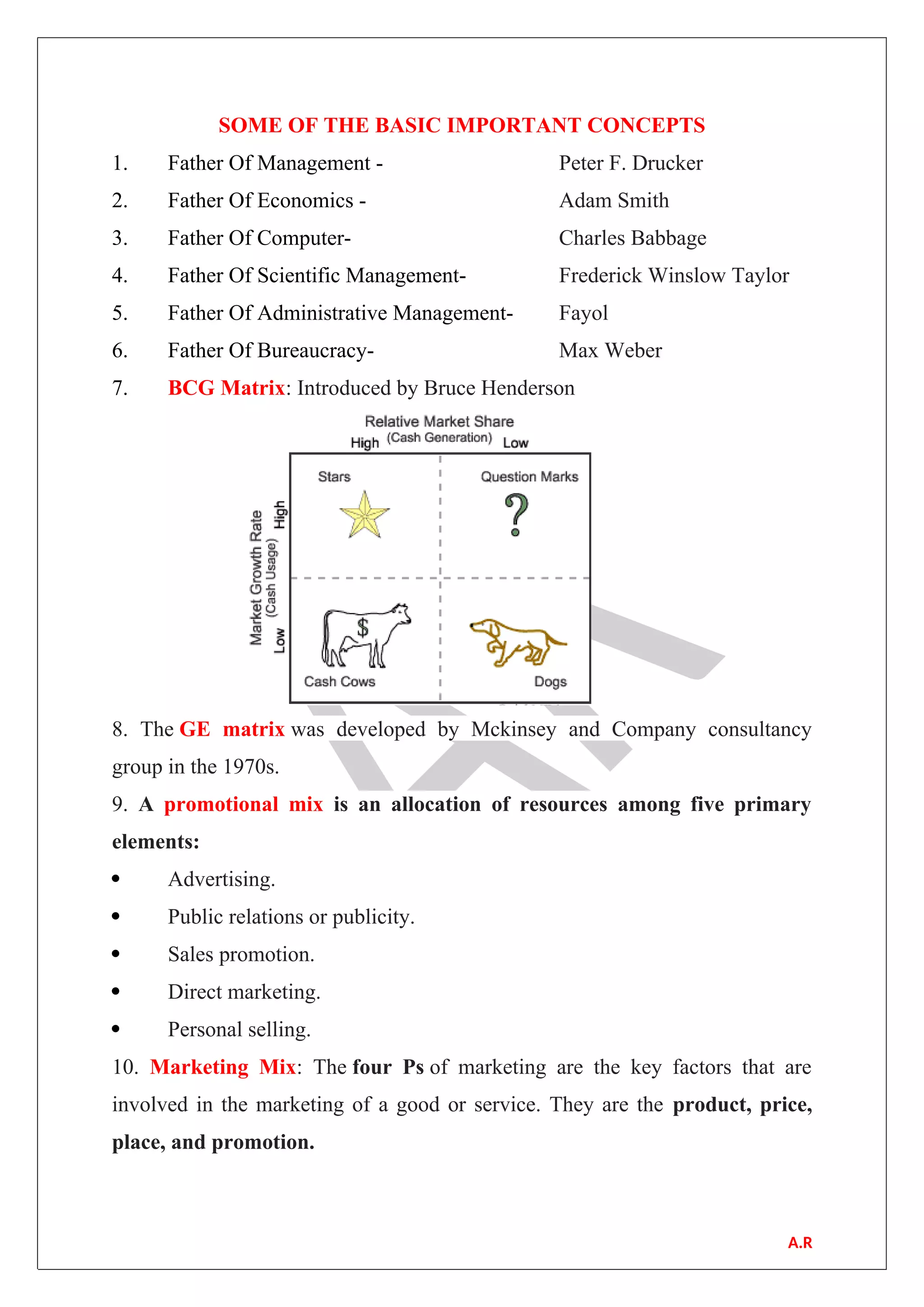 This document provides definitions and explanations of various important concepts related to management, economics, marketing, operations, human resources, and other business topics. It covers foundational ideas like the four Ps of marketing, the BCG matrix, total quality management, and benchmarking. Key terms defined include product mix, job analysis, succession planning, and customer loyalty. Important management techniques like Kaizen, the McKinsey 7S model, and transactional analysis are also summarized.
