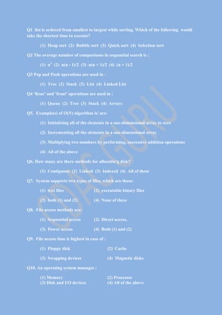 The document contains 10 multiple choice questions about computer science concepts like sorting algorithms, data structure operations, algorithm time complexities, file systems, and operating system functions. The questions cover topics like the fastest sorting algorithm for pre-sorted data, the average number of comparisons in sequential search, data structures that use push/pop and queue operations, examples of linear time algorithms, disk allocation methods, file types supported by systems, file access methods, and components managed by an operating system.