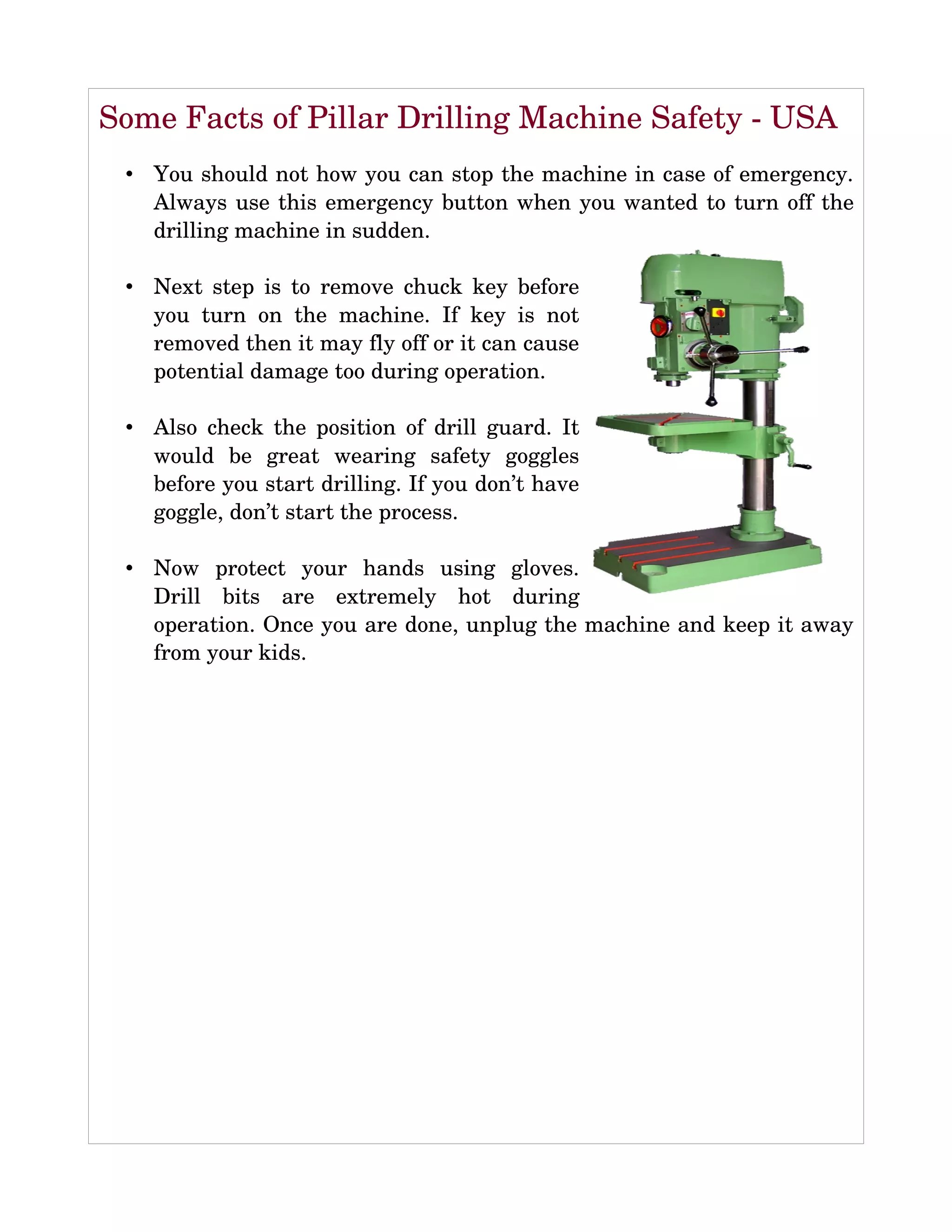 The document outlines safety guidelines for using a pillar drilling machine, emphasizing the importance of wearing protective gear like goggles and gloves. It highlights the need to ensure proper machine operation, such as removing the chuck key and using the emergency stop button. Additionally, it discusses the significance of considering torque specifications and maintaining a clean working environment.