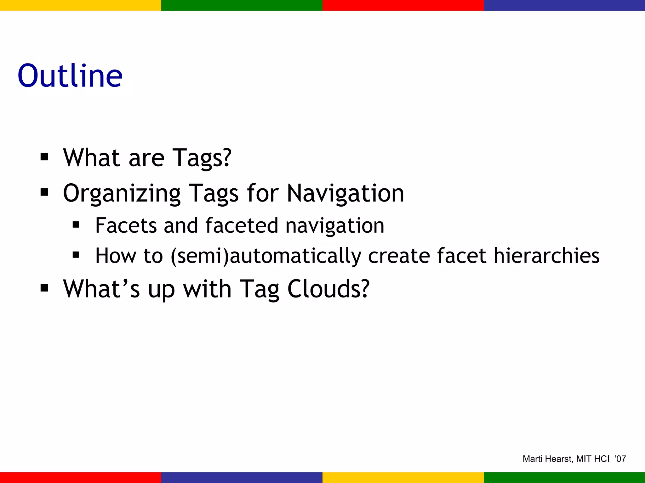 The document discusses tag clouds and issues with their design and usage. It summarizes interviews with web developers who created tag clouds. Many saw tag clouds as a fun way to represent tags but were unaware their standard alphabetical ordering. Developers hoped tag clouds would signal the presence of tags and provide an overview of site topics, but users had trouble understanding them.