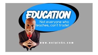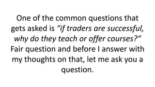 The document discusses why traders may choose to teach or offer trading courses even if they are successful traders. It notes that some traders enjoy teaching and interacting with students, and that teaching helps with repetition, which can boost confidence and success. Additionally, creating a trading course or teaching can be a smart way to generate additional income through a new "stream of revenue". The document urges caution in choosing trading educators and outlines some red flags to watch out for, such as educators who do not actually trade or those only interacting through forums. It recommends vetting an educator's history and experience and following one's gut feelings about their authenticity as a trader versus a pure marketer. Overall, the document argues that paying for a quality trading