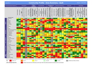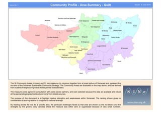 The document provides demographic and socioeconomic data for 36 community areas in Somerset, England. It includes statistics on population size and density, age demographics, income levels, employment rates, education levels, health outcomes, crime rates, and perceptions of community belonging and safety. The data suggests there is variability across communities in Somerset in terms of socioeconomic challenges and quality of life.