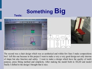 This document summarizes the development of a furniture design project. The designer created a chair and table that went together. Through multiple iterations and testing different designs, the designer settled on a design for a multi-purpose table that could be extended, as well as a chair designed for aesthetics, function, safety, and simplicity. The final chair design was inspired by traditional Ethiopian designs and incorporated a finger joint construction and press-fit assembly method. Though a full-scale model could not be produced due to machine limitations, the small-scale prototype demonstrated good structure, balance and strength.