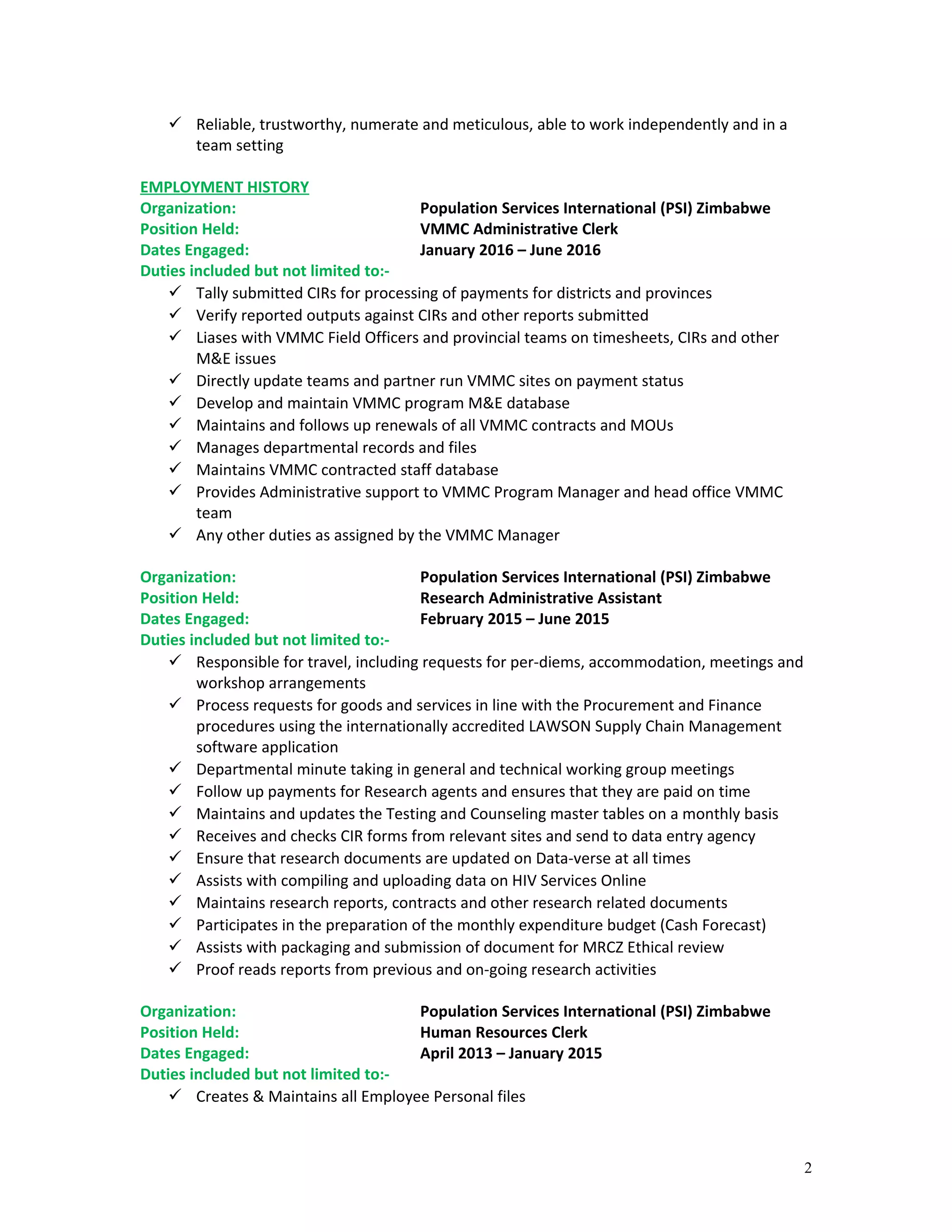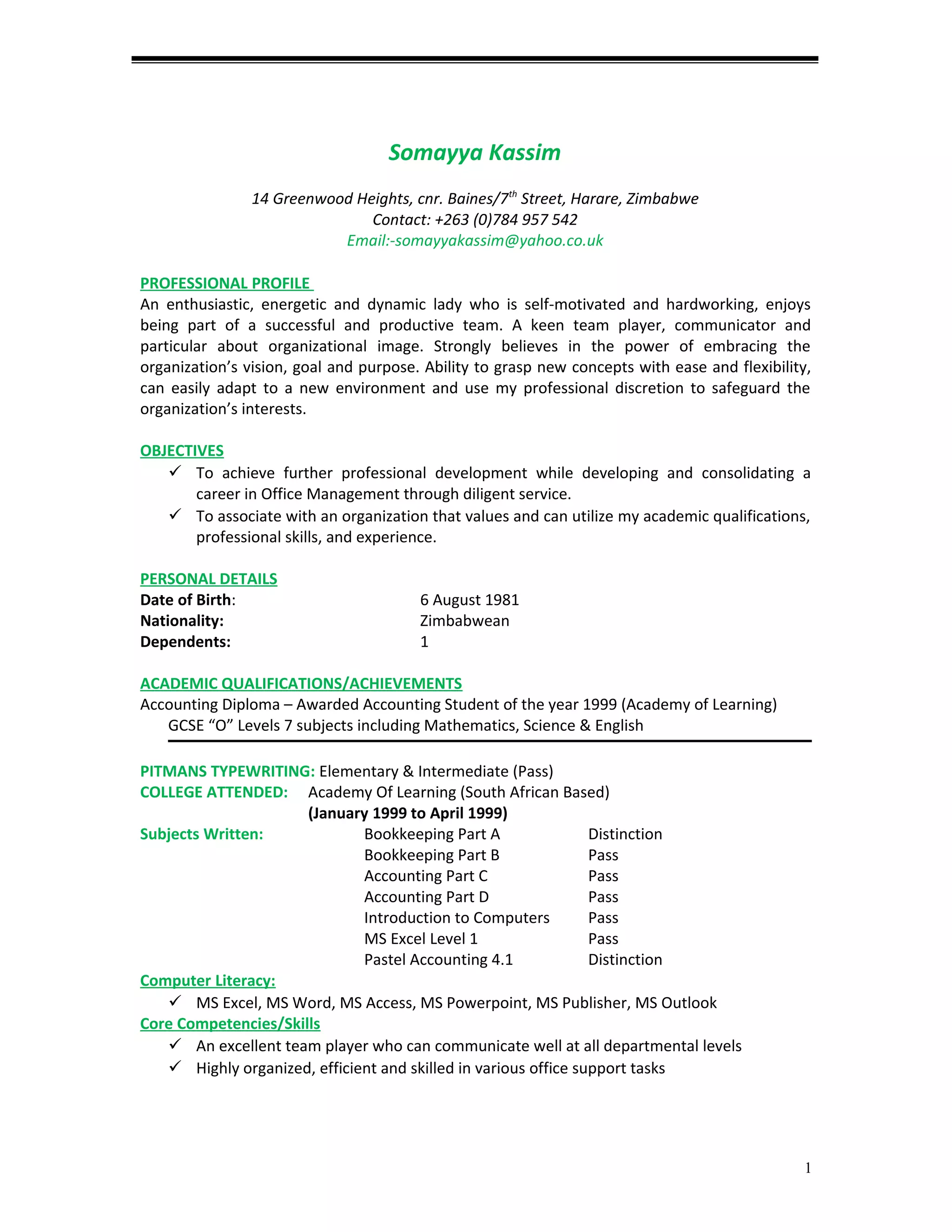 Somayya Kassim is a Zimbabwean professional with over 15 years of experience in office management, administration, and human resources roles. She has a diploma in accounting and various computer skills. Her career has involved roles of increasing responsibility at Population Services International Zimbabwe, including administrative clerk, research assistant, human resources clerk, receptionist, and human resources assistant. She is seeking a new opportunity to continue her professional development and utilize her skills and experience.