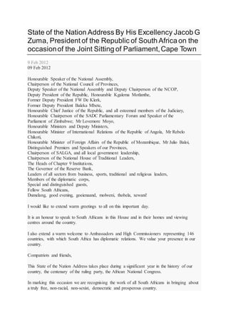 This document is the State of the Nation Address given by President Jacob Zuma of South Africa on February 9, 2012. In the summary, Zuma highlights that while progress has been made in areas like health, education, and infrastructure, unemployment, poverty, and inequality persist, especially among black South Africans, women, and youth. Zuma announces that the government will take decisive action to grow the economy and address these challenges head on. Recent figures show unemployment declining and 365,000 new jobs created in 2011, though more work remains given global economic conditions.