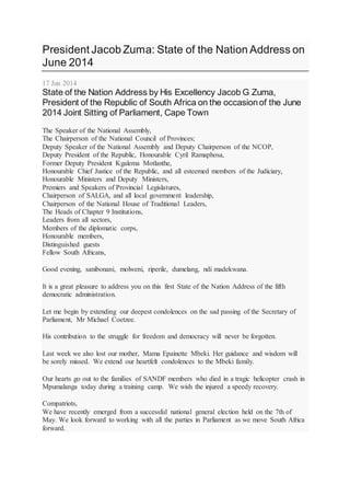 This summary provides an overview of South African President Jacob Zuma's 2014 State of the Nation Address: