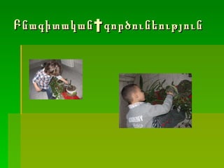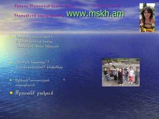 копия копия Sona n 2011 h 1. Մխիթար Սեբաստացի կրթահամալիր Հաշվետվություն Գեղարվեստի դպրոց - պարտեզ www.mskh.am Ծրագիրը նախատեսված է 2-3 տարեկանների համար Դաստիարակ ` Սոնա Նիկոլյան Ծրագրի նպատակը ` Դաստիարակության խնդիրները Երեխայի առողջության ամրապնդում : Զբոսանք բակում 2. 3. 4. 5. 6. 7. 8. 9. 10. 11. Ֆիլմաշար http :// www.youtube.com /watch?v=tS8LEwncOrE http://www.youtube.com/watch?v=Ei1wSNYV0CA&feature=related http://www.youtube.com/watch?v=8uNAanwxPDE&feature=related http://www.youtube.com/watch?v=TYEoPOiDiTI&feature=related http://www.youtube.com/watch?v=0Root99i-FY&feature=related http://www.youtube.com/watch?v=JrjvWRWh_vw&feature=related http://www.youtube.com/watch?v=CoK4tNJ1Nfg&feature=related http://www.youtube.com/watch?v=PVct8b2PVvo&feature=related http://www.youtube.com/watch?v=GNXXIgFyrTQ&feature=related http://www.youtube.com/watch?v=y_SxHSWMkUw&feature=related http://www.youtube.com/watch?v=PqVOUW_qDJA&feature=related http://www.youtube.com/watch?v=YRXcTLipAYQ&list=UUJqnt6gzcr2goNB4RMF-L1w&index=5&feature=plcp http://www.youtube.com/watch?v=w-Ki4SYb1W0&feature=BFa&list=UUJqnt6gzcr2goNB4RMF-L1w&lf=plcp 12. Հետազոտական աշխատանքներ Ստեղծվել են ուսումնական նյութեր Notebook ծրագրով նյութեր Տեսանյութեր Ֆիլմեր Youtube Խաղերի թարգմանություն Կրթակամալիրյան կայքի սպասարկում Անհատական ուսումնական թղթապանակի կազմում Սանի զարգացման, գնահատման սանդղակի կազմում 13. 14.