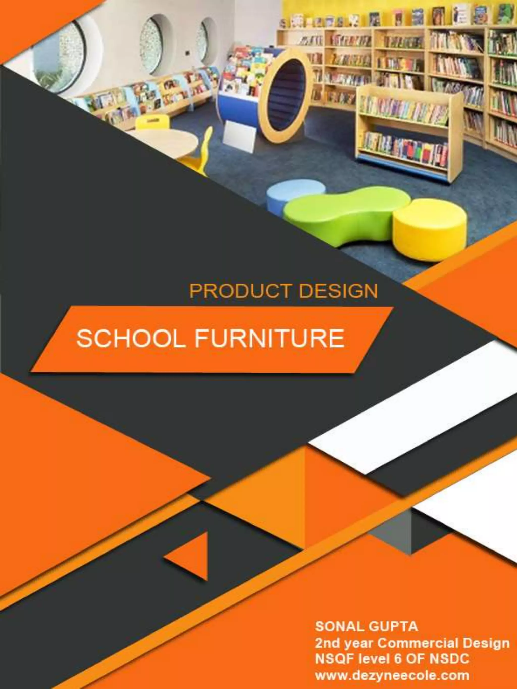 Sonal Gupta submitted a project report on the design of a library reference desk for higher secondary students. The report includes research on popular desk designs used in school libraries, sketches of potential shapes and forms, and material considerations. It also provides orthographic projections and detailed drawings of the proposed curved desk design. The design aims to provide a functional workspace for the librarian with separate areas for student passes, computer, printer, and circulation materials.