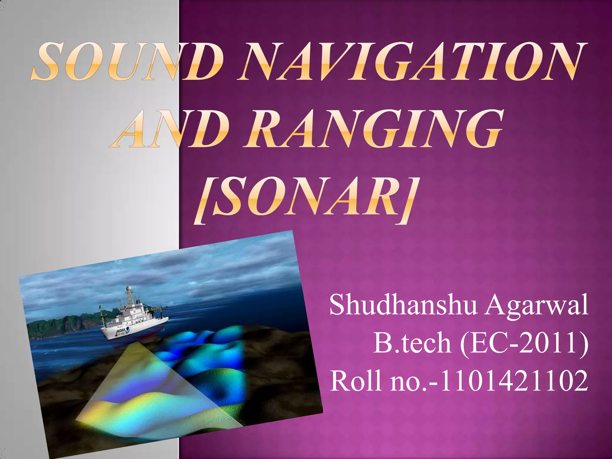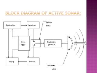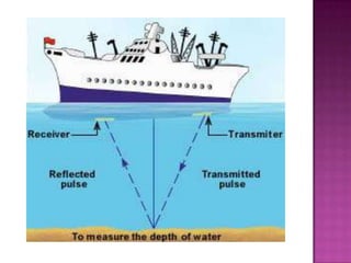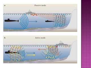The document discusses sonar, which uses sound waves to detect underwater objects. It describes how sonar works by transmitting sound pulses and measuring the reflection to determine distances. There are two main types: active sonar, which transmits pulses and listens for echoes, and passive sonar, which only listens for sounds without transmitting. The document outlines the key components of sonar systems and how they are used for applications like mapping ocean depths and detecting ships and submarines. It also notes some negative impacts on marine animals.