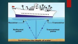 This document provides an overview of sonar technology. It discusses the history of sonar, beginning with its use by animals and early experiments by Leonardo Da Vinci and others. It describes the main types of sonar - active and passive. Applications include ocean mapping, locating ships and submarines, and underwater security. Limitations include impacts on marine life and noise pollution. New innovations are described, including a technique called Finger IO that allows interaction with mobile devices by writing or gesturing on nearby surfaces using built-in microphones and speakers.