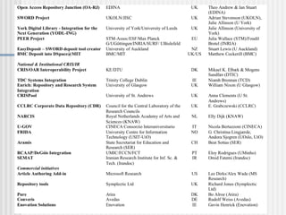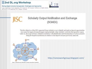 The SONEX Workgroup, led by Pablo de Castro and Peter Burnhill, addresses interoperability in repository systems, comparing its pragmatic approach to the theoretical frameworks of dl.org. Established during the Institutional Repositories Workshop in 2009, SONEX focuses on use-case scenarios for publisher deposits, CRIS/institutional repository integration, and funder mandates. Current tasks include supporting selected JISC projects and disseminating information for international cooperation.