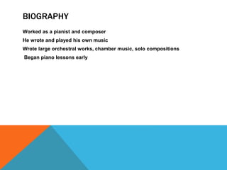 Ivan Drago is a pianist and composer who wrote his own music including large orchestral works, chamber music, and solo compositions. He began piano lessons early in life and has also set film scores and composed operas during the impressionist era. The document discusses one of Drago's pieces, a string quartet written in 1927-1928 that was premiered in 1928 to critical acclaim and influenced the composer, seen as his "Second Birth". The piece is set in four movements in F minor and shows influences from Stravinsky and Schoenberg while combining romantic orchestration with 20th century compositional techniques.