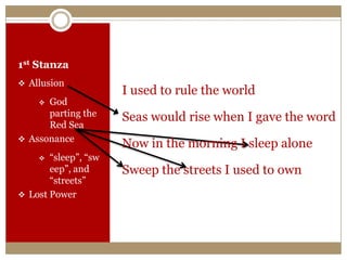 This analysis summarizes and annotates the lyrics of the Coldplay song "Viva La Vida". It breaks the song into 7 stanzas and identifies literary devices and biblical allusions used. The overall theme is about a king who has lost his power and kingdom, reflecting on how power corrupted him when he ruled the world and caused his downfall.