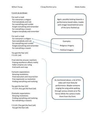 The document contains lyrics from 5 songs being considered for music videos. The summaries are: