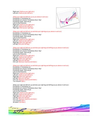 The document provides instructions for performing a dance called the Pinocchio. It instructs dancers to hold up their right and left arms, kick their right and left legs, nod their head up and down, and spin in time with music. The dance gets progressively more complex with each repetition by adding additional movements.
