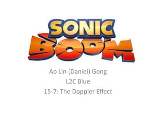 This document discusses sonic booms and the conditions needed to create them. Sonic booms occur when an object moves faster than the speed of sound in air. This creates shock waves that combine into a loud boom sound. For a sonic boom to occur, the object's speed must exceed the speed of sound. As it passes a stationary observer, they will hear the boom after the object passes, as the compressed sound waves reach the observer. Famous examples of objects breaking the sound barrier and creating sonic booms include supersonic jets and the fictional character Sonic the Hedgehog.