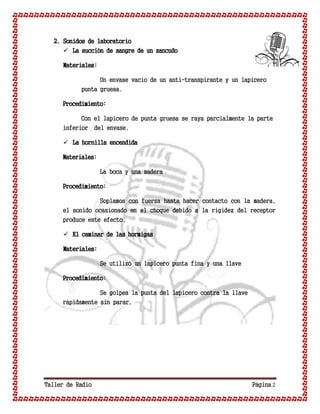 Este documento presenta una variedad de sonidos naturales y de laboratorio que fueron grabados o recreados para uso en la radio. Entre los sonidos naturales se incluyen el tránsito vehicular, una licuadora, una sartén friendo, un río y el mar. Los sonidos de laboratorio fueron creados usando materiales como un envase de anti-transpirante, madera, un lapicero, una llave, un chicle y papel para imitar sonidos como la succión de un zancudo, una hornilla encendida, las hormigas caminando, una
