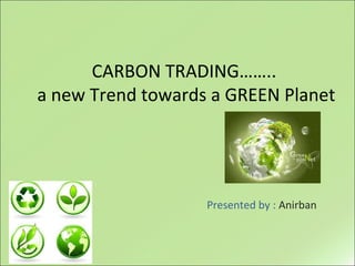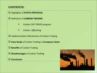 This document discusses carbon trading as a mechanism under the Kyoto Protocol to reduce greenhouse gas emissions. It defines carbon trading as a cap-and-trade program where countries are given an emissions cap and can trade excess allowances. The document outlines the Kyoto Protocol commitments, describes the EU Emissions Trading Scheme in its phases, and discusses benefits like alternative energy incentives but also disadvantages like a lack of centralized oversight.