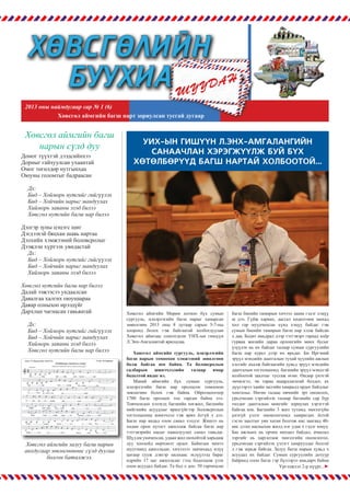 ñóðãóóëèóäàä “Áðèòàíèêà íýâòýðõèé òîëü” îëãîâ. • Ñóìûí ñóðãóóëèóäàä ìýäýýëýë ç¿éí ëàáîòàðè, áàãø õºãæëèéí òºâèéã áàéãóóëàâ. • Õºâñãºë àéìãèéí ̺ðºí ñóìàíä сургууль, цэцэрлэгийн Çàõèðàë, ìåíåæåð¿¿äòýé óóëçàëò çîõèîí áàéãóóëàâ. • 2012 онд 23 ñóì 1 òîñãîíûã á¿õ áàãø, àæèë÷èäòàé áèå÷ëýí óóëçàæ, õºãæëèéí áîäëîãî áîëîâñðóóëëàà • 2012 онд “Îþóíëàã Õºâñãºë÷¿¿ä” õºòºëáºðèéí õ¿ðýýíä Èõ äýýä ñóðãóóëèéí 100 øèëäýã îþóòàíä ñóðãàëòûí òýòãýëýã îëãîëîî. ■ Ìîíãîë ¯íäýñíèé ¯íýò ªâ ñî¨ëûã ò¯ãýýã× ÓÈÕ-ûí ãèø¯¯Í Ë.Ýíõ-Àìãàëàí ªâñíèé ¯íäýñ õªòªëáªð, Êàíàä ñàíòàé õàìòðàí áîëîâñðîëûí ñàëáàðò õªðªí㪠îðóóëàëò øèéäâýð믯ëëýý. ÓÈÕ-ûí ãèø¯¯í Ë.Ýíõ-Àìãàëàíãèéí Õªâñãªë àéìãèéí Áîëîâñðîëûí ñàëáàðò 2012 îíä õèéñýí àæëóóäààñ... Äýëõèéí áàíêíû ñàíõ¯¯æèëòýýð 4 ñóìàíä ãýð öýöýðëýã îëãîíî УИХ-ын гишүүн Л.Энх-Амгалан Япон Улсын засгийн газраас Монгол Улсад хэрэгжүүлж буй “Өвсний үндэс” хөтөлбөрт санал тавьсны дагуу Урандөш зуслангийн их засвар, Цэцэрлэг сумын Могой голын багт 50 хүүхдийн шинэ цэцэрлэг бариулахаар хөрөнгө оруулалтын асуудлыг шийдвэрлэлээ. Мөн 2013 оны эхний улиралд Канад сангийн төсөл шалгаруулалтад Рашаант сумын сургуулийн захирал удирдлагуудтай хамтран дотуур байрын тохижолтод 22.000 долларын, Хатгал сумын гар урчуудын сургалт, үйл ажиллагаанд 18,300 долларын санхжүүжилтийг тус тус шийдвэрлүүлэв. ■ Á à ã ø Ä.Äîðæïàãìà íü ìîíãîë õýë, óðàí çîõèîëûí áàãøààð 36 æèë àìæèëòòàé àæèëëàæ áàéãàà. Ìîíãîë ¿íäýñíèé ýõ õýëíèé îíöëîã íü á¿õ õ¿ì¿¿ñèéí ºäºð òóòìûí áîëîí áîëîí íàñàí òóðøèéí õýðýãëýý áîëäîã, ìºí Ìîíãîë ¿íäýñíèé ¿íýò ºâ ñî¸ë áîëîõûã óõàìñàðëàí ºñâºð õîé÷ ¿åäýý ºâë¿¿ëýõèéã õè÷ýýí á¿òýýë÷ýýð àæèëëàäàã àæèë ìýðãýæèëäýý ñýòãýëòýé, ñîíèðõîëòîé ìàíàé àéìãèéí øèëäýã áàãø íàðûí íýã þì . Áàãøëàõóéí àæëààñ ãàäíà ìîíãîë áè÷ãèéí óðàí áè÷ëýãèéí îëîí òºðëèéí ãàéõàìøãèéã ñóðàã÷èääàà ºâë¿¿ëýõ çîðèëãîîð ñóðãóóëü äýýðýý 2001 îîíîîñ “Áè÷èã-Óðëàã” óðàí áè÷ëýãèéí äóãóéëàíã ¿¿ñãýí áàéãóóëæ Ìîíãîë áè÷ãèéí öýâýð ãî¸ áè÷èãòýí, áèéðèéí áè÷âýð, ñèéëáýð, õàé÷èëáàðûí îëîí øàâü íàðòàé áîëñîí áàéíà. Òóõàéëáàë: Óëñûí àíõäóãààð ñàéõàí áè÷ãèéí óðàëäààíû òýðã¿¿í áàéðûí øàãíàëòàí êîìïüþòåð ãðàôèê÷ Æ.Íàöàãäîðæ, òºðºëõ ñóðãóóëüäàà ìîíãîë õýëíèé áàãøààð àìæèëòòàé àæèëëàæ áóé Á.Àëèìàà íàðûã äóðüäàæ áîëíî. Ò¿¿íèé óäèðäàæ áóé ñîíãîí íü óðàí áè÷ëýãýýñ ãàäíà ø¿ëýã áè÷èõ, äóóëàõ, á¿æèãëýõ, æ¿æèãëýõ çýðýã òºð뺺ð ¿éë àæèëëàãàà ÿâóóëæ õ¿¿õýä áàãà÷óóäûí àâüÿàñ áèëãèéã íýýí õºãæ¿¿ëæ áàéíà. Òóõàéëáàë: Øàâü Á.È÷èíõîðëîî, Æ.Ýíõæàðãàë, Ø.Àëòàíãèíæ íàð Ìîíãîë áè÷ãèéã àíõ õóâöàñíû çàãâàðò îðóóëæ “¯íñãýëæèí” òýìöýýíä îðæ áà ýíý ñàíàà ºíººäºð ¿íäýñíèé õýìæýýíèé õýðýãëýý áîëñîí áàéíà. Ìîíãîë õýë, áè÷ãèéã ã¿íçãèéð¿¿ëýí ñóäàëñíààð ñóðàã÷èä ýõ õýëýíäýý ýëýãòýé, ýìõ öýãöòýé, òýâ÷ýýðòýé, á¿òýýë÷ ñýòãýëãýýòýé áîëäîã áèëýý. Ìýðãýæèë íýãò çàëóó áàãø íàðòàé àðãà òóðøëàãààñàà õóâààëöàí “Ìîíãîë õýë áè÷èã çààõ àðãàä òóëãàìäàæ áóé àñóóäàë” ñýäâýýð èëòãýë áè÷èæ õýëýëö¿¿ëñýí. ̺í ãàâüÿàò áàãø Ä.Áàòñóóðü áàãøèéí íýðýìæèò ìîíãîë õýë, áè÷ãèéí îëèìïèàä, “Áè÷èã - Óðëàã” ñîíèíû 10 æèëèéí îéä çîðèóëñàí “Óðàí áè÷ëýã”, “Õè÷ýýíã¿é áè÷ëýã”-èéí óðàëäààí çýðýã îëîí á¿òýýë÷ àæëóóäûã çîõèîí áàéãóóëñàí áàãø þì. Çàâõàí àéìãèéí Èäýð ñóìàíä çîõèîí áàéãóóëàãääàã áàðóóí á¿ñèéí ìîíãîë õýëíèé îëèìïèàäàä øàâü íàðûíõàà õàìò îðîëöîæ òýðã¿¿í áàéð ýçýëñýí áàéíà. Ä.Äîðæïàãìà áàãø 30 ãàðóé æèëèéí õºäºëìºð á¿òýýëýý ÁÒÀ, õºäºëìºðèéí õ