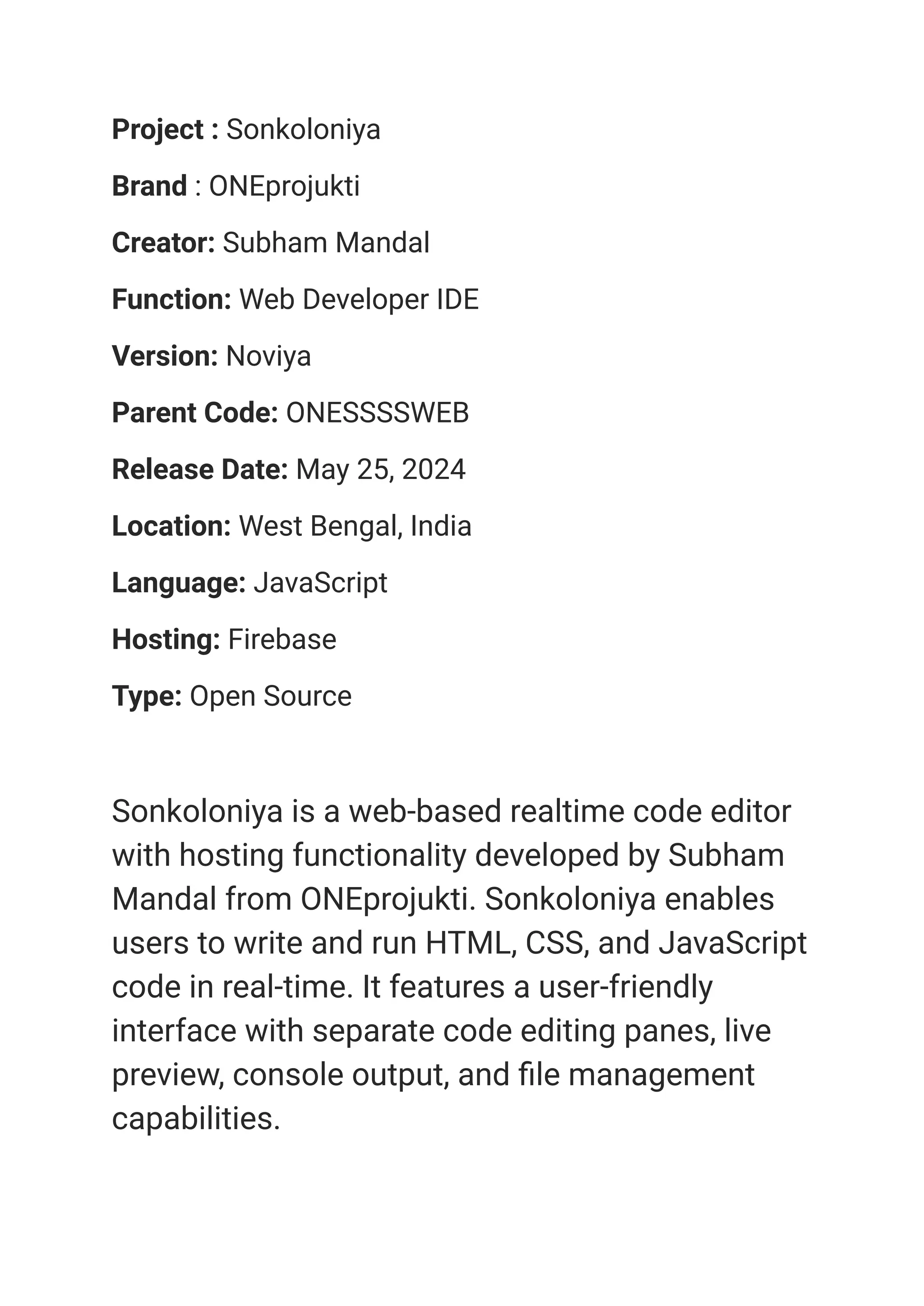 Sonkoloniya is an open-source, web-based real-time code editor developed by Subham Mandal under the Oneprojukti brand, enabling users to write and execute HTML, CSS, and JavaScript seamlessly. Key features include code editing with CodeMirror, live preview, file management, and a user-friendly interface designed for optimal usability. Currently in beta, Sonkoloniya has no official portal yet, but documentation and beta access can be found online.