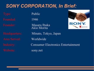 Sony Corporation is a Japanese multinational conglomerate corporation headquartered in Tokyo, Japan. It was founded in 1946 and has a wide range of consumer electronics, entertainment, and online services. Sony uses a variety of marketing strategies to promote its products, including advertising, personal selling, sales promotions, and publicity. It spends heavily on promotions, especially for its digital camera and VAIO laptop lines. Sony aims its marketing especially at youth and uses innovative campaigns to portray a unique lifestyle and brand image.