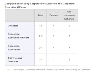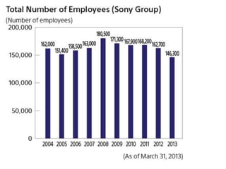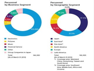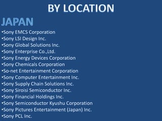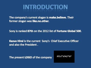 Sony Corporation was established in 1946 as Tokyo Tsushin Kogyo K.K. in Tokyo, Japan. Over the decades, Sony expanded significantly through acquisitions and opening production plants globally. Major acquisitions included Columbia Pictures Entertainment in 1989 and CBS Records in 1988. Sony also diversified over time, entering new businesses such as music, films, financial services and more. The company has faced challenges in recent years including losses, security breaches and job cuts as it aims to strengthen its businesses and brand.