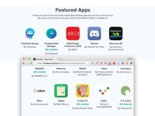 The document discusses React Native, a framework that allows developers to build native mobile apps using JavaScript and React. It highlights that native mobile app development is difficult due to issues like lack of code sharing and low iteration speed. React Native addresses these issues by allowing developers to write once and deploy their code to both Android and iOS. The document provides an overview of React Native concepts like components, styling, and setup instructions for Android development. It concludes by noting benefits like fast iteration and the ability to deploy code updates directly to users without app store approval.