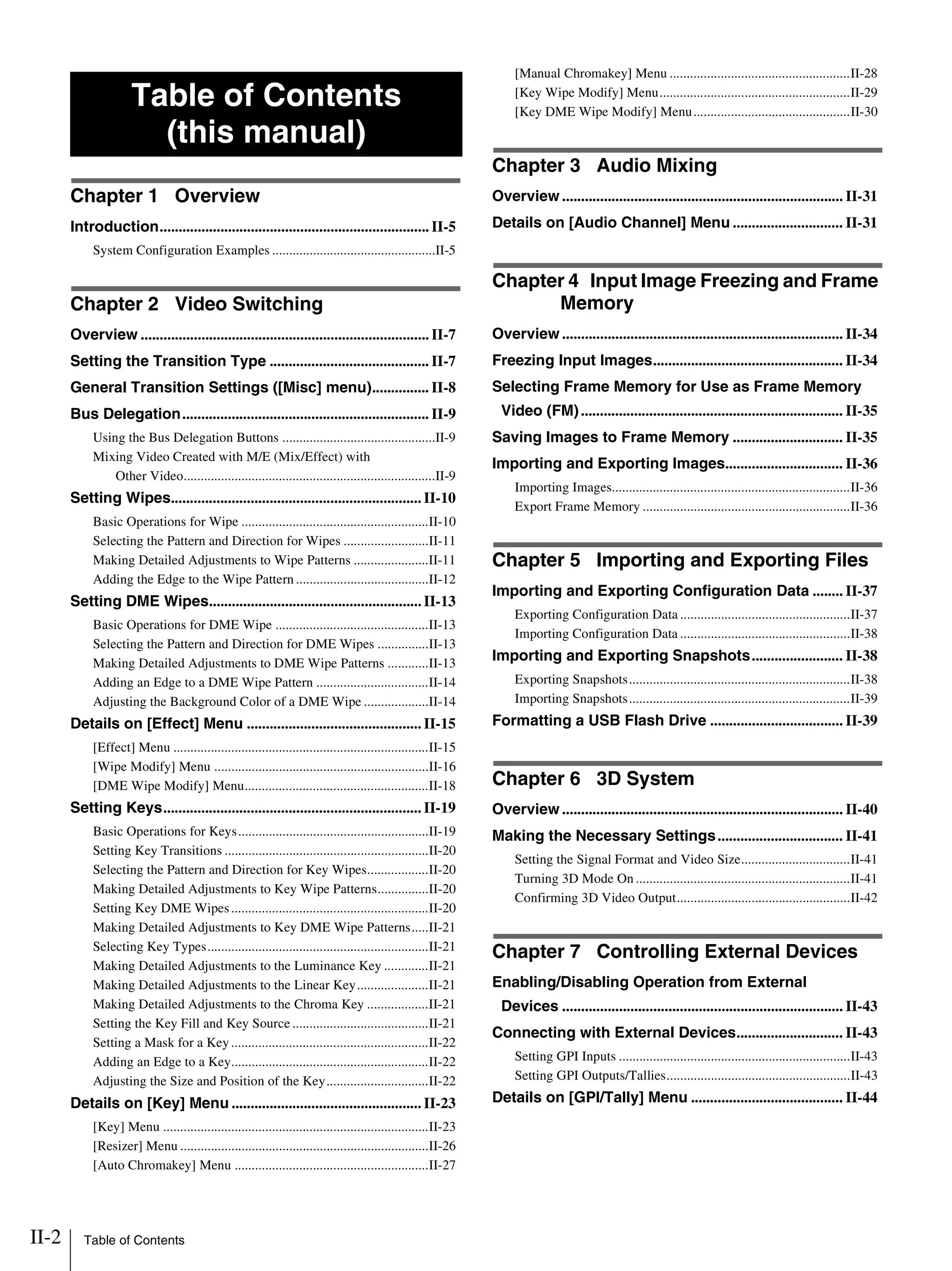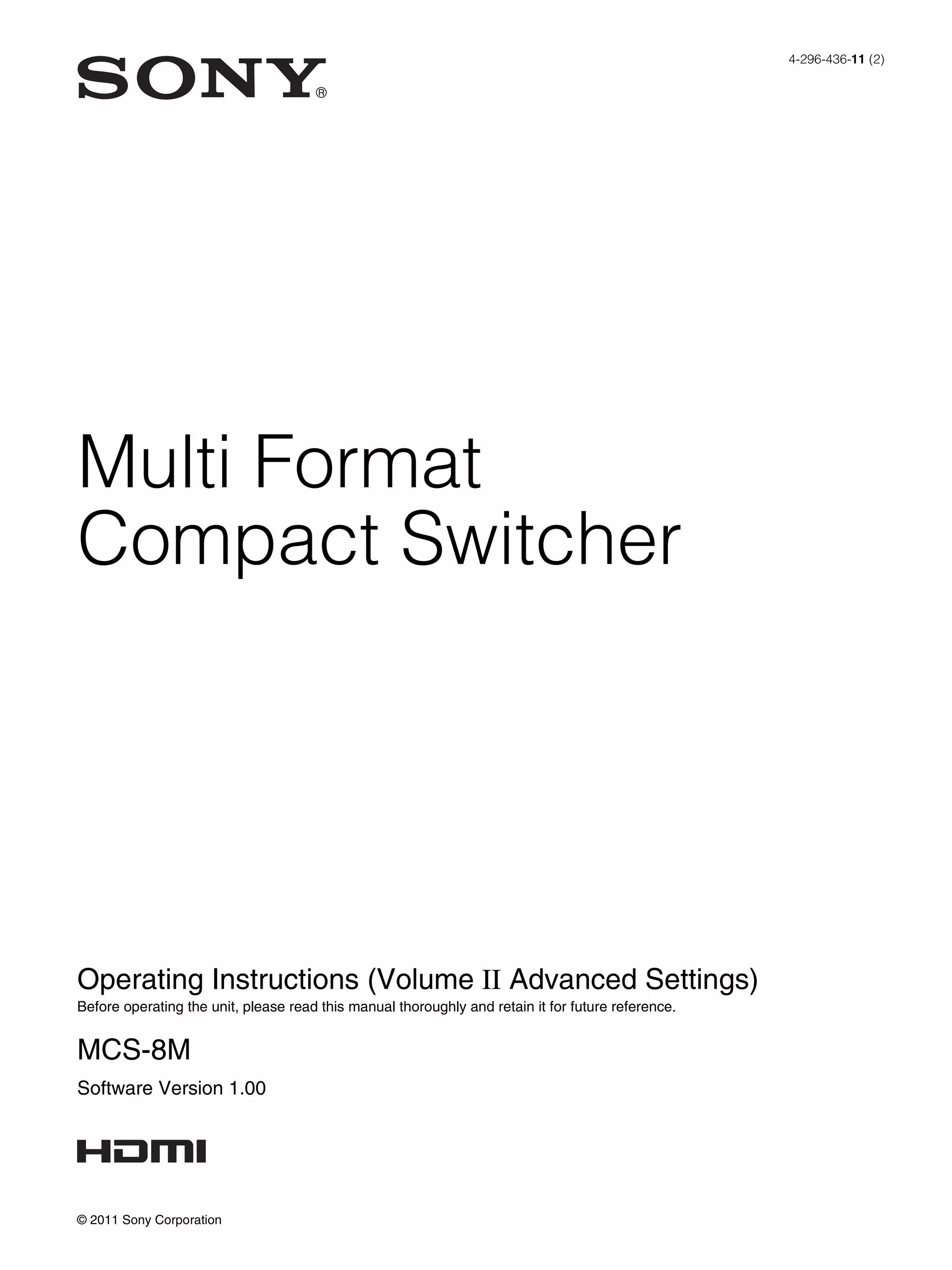 This operating manual provides detailed instructions for advanced settings of the Sony Multi-Format Compact Switcher, including video and audio mixing, transitioning effects, and 3D system configurations. It covers menu navigation, setup procedures, and the use of various effects such as wipes and keys for sophisticated video switching operations. Key chapters include video switching overview, audio mixing, and controlling external devices, with references to basic operation instructions in a separate volume.