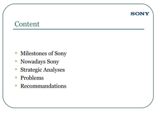 The document outlines key milestones in Sony's history from 1946 to present day. It established Tokyo Telecommunications Engineering Corporation in 1946 and innovated Japan's first electronic rice cooker. Sony became a global leader in consumer electronics through pioneering products like the transistor radio, Walkman, CD player, and PlayStation. The document also analyzes Sony's business strategies, strengths, weaknesses, opportunities, threats, and competitors in various product categories like audio-visual equipment, game consoles, and MP3 players. It recommends Sony continue innovation, pay closer attention to rivals, and accept preferred technologies and formats.