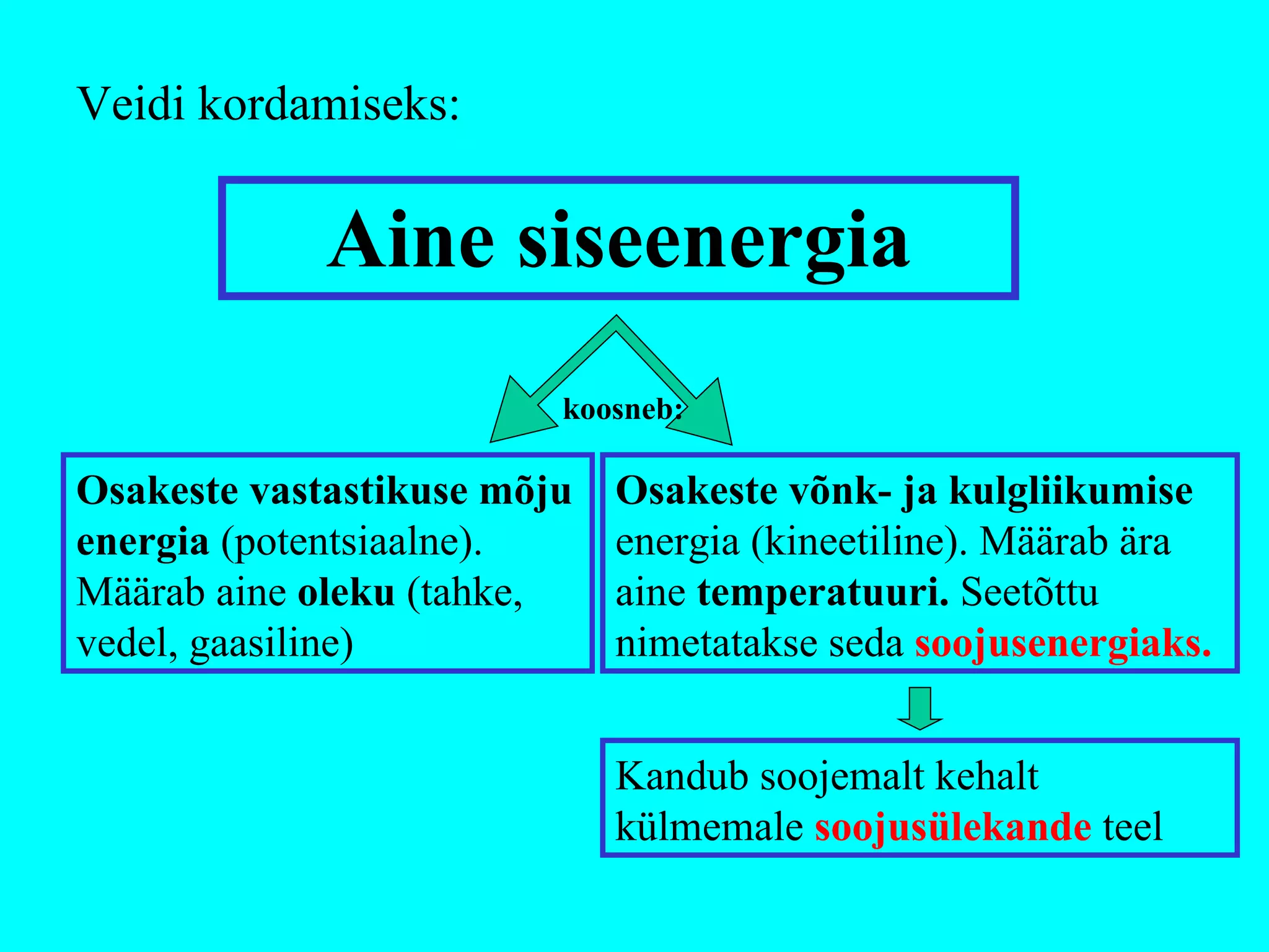 Aine siseenergia Osakestevastastikuse mõju energia (potentsiaalne). Määrab aine oleku (tahke, vedel, gaasiline) Osakeste võnk- ja kulgliikumise energia (kineetiline). Määrab ära aine temperatuuri. Seetõttu nimetatakse seda soojusenergiaks. Veidi kordamiseks: Kandub soojemalt kehalt külmemale soojusülekande teel koosneb: