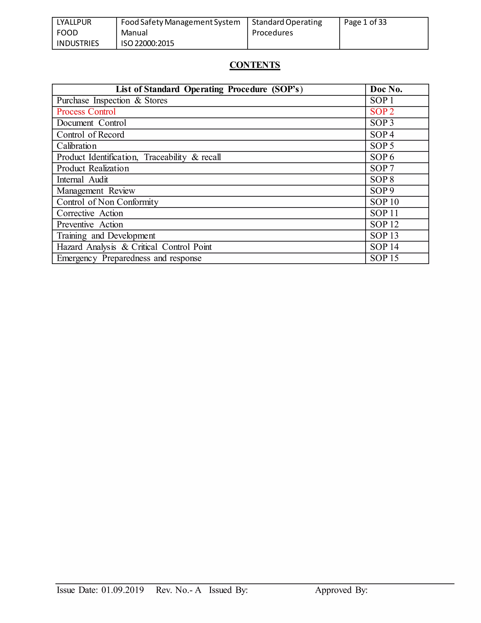 This document contains the standard operating procedures (SOPs) for Lyallpur Food Industries' food safety management system which complies with ISO 22000:2015. It includes 15 SOPs covering topics such as purchase inspection and stores, process control, document control, control of records, calibration, product identification and traceability, internal audits, management reviews, and more. For each SOP, it describes the goal, responsibilities, and detailed procedures to be followed.