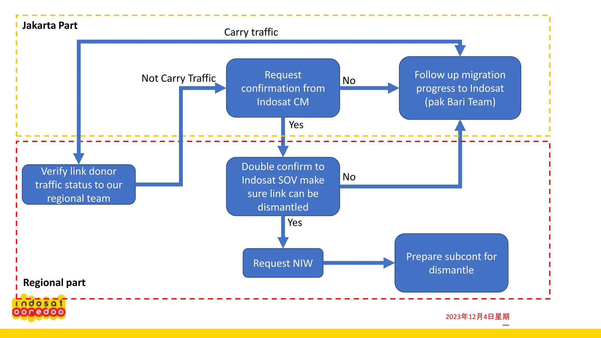 The document provides standard operating procedures for dismantling Indosat links. It outlines steps such as verifying traffic status, confirming with Indosat that the link can be dismantled, preparing permits and contacting site managers for access. Technicians are instructed to switch off equipment in a certain order, contact network operations centers, and confirm no issues occur after dismantling. Photographs must be taken before and after, and a dismantling report completed. Engineers must supervise all work. Dismantling includes antennas, cables, grounding equipment, and indoor hardware while ensuring alarms are addressed.