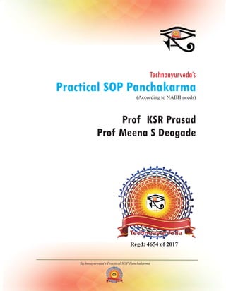 The document outlines the publication titled 'Technoayurveda's Practical SOP Panchakarma,' authored by Prof. KSR Prasad and Prof. Meena Deogade, focusing on standard operating procedures for panchakarma in accordance with NABH guidelines. It emphasizes the comprehensive, educational, and methodical approach taken by the authors in detailing the procedures and benefits of panchakarma while providing a valuable resource for students and practitioners in Ayurveda. The publication aims to enhance understanding and proper implementation of panchakarma practices, promoting a better standard of care within the field.
