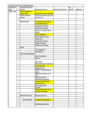 This document outlines audit procedures and quality control processes for a factory that produces garments. It includes sections on production status and process management, quality checks of fabrics, trims, samples, cutting, sewing, washing, finishing, packing and quality assurance procedures. Specific checks include fabric inspection, defect tracking, measurements, strength testing, shade matching, shrinkage tests, machine maintenance logs, hourly audits, and packing audits to ensure quality standards are met.