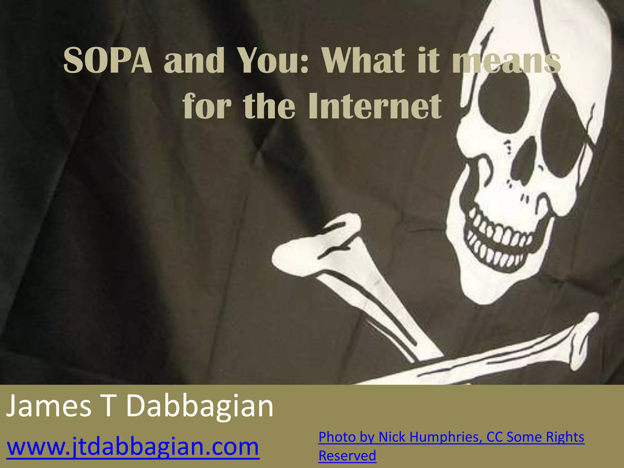 SOPA (Stop Online Piracy Act) allows copyright holders to force ISPs to block websites deemed to promote piracy. This could result in entire sites like Facebook and YouTube being blocked if any user-uploaded content violates copyright. SOPA is opposed by tech companies like Google and Wikipedia because it gives too much power to censor the internet and could negatively impact free expression. The document encourages readers to contact their representatives to voice opposition to SOPA and help protect internet freedom.