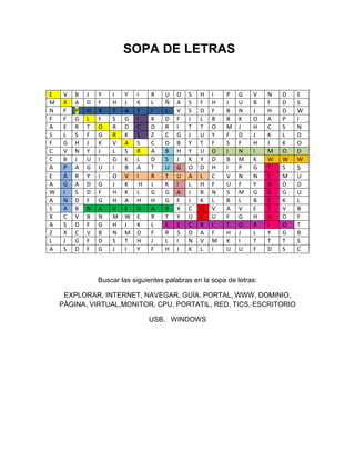This document contains a "sopa de letras" or word search puzzle in Spanish. It provides a list of 15 words or terms in Spanish related to computers and the internet for the reader to find hidden within the letter grid.