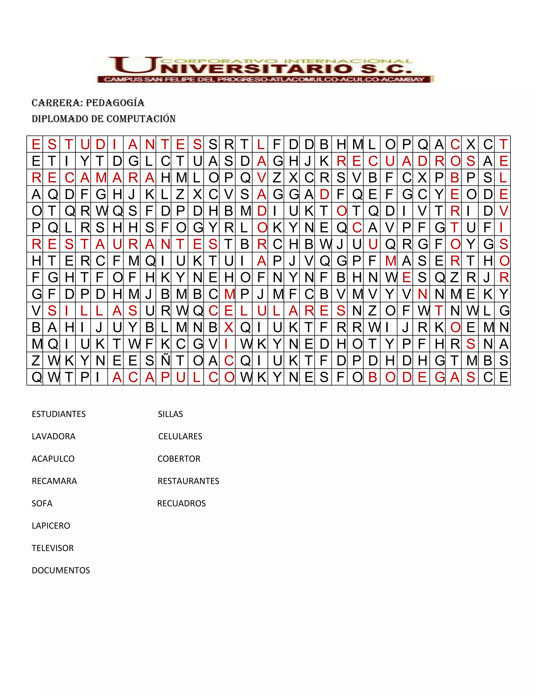 This document is about Cecilia Martinez Hernandez, a student studying pedagogy. It contains scrambled letters that when unscrambled spell out various items like ESTUDIANTES, SILLAS, LAVADORA, CELULARES, ACAPULCO, COBERTOR, RECAMARA, RESTAURANTES, SOFA, RECUADROS, LAPICERO, TELEVISOR, and DOCUMENTOS.